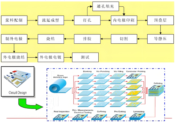 Основной процессLTCCТехнология заключается в следующем: во -первых, керамический порошок, стеклянный порошок и органические переплеты смешиваются, а затем обрабатывают в зеленые керамические ленты с точной толщиной и плотной структурой с помощью литья ленты, сушки и других процессов. Впоследствии требуемые схемы цепи изготовлены на зеленых керамических лентах с использованием таких технологий, как лазерное бурение, микроволонное измельчение и печать в пастых проводниках. Затем несколько обработанных зеленых керамических лент ламинированы и интегрированы и спечены в низкотемпературной среде ниже 900 ° C. Наконец, чип -устройства могут быть произведены; Он также может встроить несколько пассивных компонентов для образования одного трехмерного керамического подложки многослойной цепи; Кроме того, ICS и активные устройства могут быть установлены на ее поверхности для создания пассивных/активных интегрированных функциональных модулей. Эта технология может дополнительно способствовать миниатюризации и высокой уплотнении цепей и особенно подходит для производства компонентов в высокочастотной области связи.