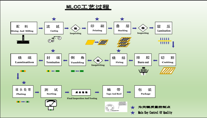 MLCC(мульти -слой керамический конденсатор) является широко используемым типом конденсатора. Его структура образуется путем интерреляции и укладывания керамических диэлектрических пленок, напечатанных внутренними электродами, спекания при высокой температуре, образуя керамический блок, а затем герметизируя металлические слои на обоих концах. Он состоит из трех частей: керамические диэлектрические, металлические внутренние электроды и внешние электроды металла.MLCCимеет преимущества небольшого объема, большую емкость, низкие потери на высоких частотах, пригодность для массового производства, низкую цену и хорошую стабильность. Он отвечает требованиям легких, тонких, коротких и небольших продуктов по информационной функции и является важным компонентом в современных электронных продуктах. Каков производственный процесс MLCC?